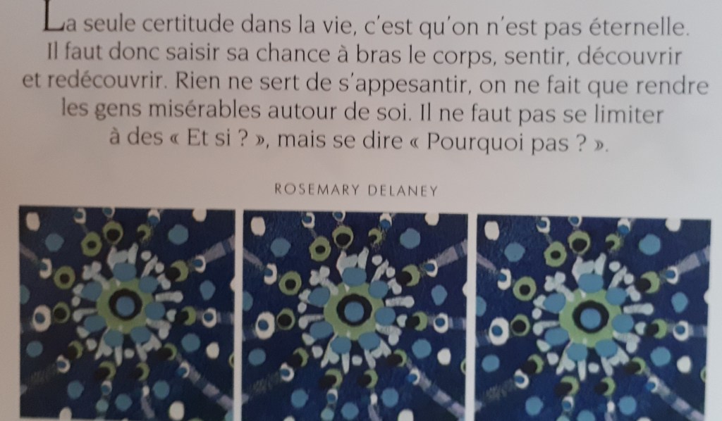 Et cela, tout en douceur, en acceptant les inconnues et parfois les va et vient. Tout est mouvance Chaque jour n’est-il pas une opportunité d’apprendre ?